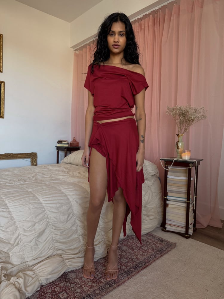 Brigitte drapes softly off the shoulder, skimming the body with effortless ease. Cut in a rich rouge, it balances sensuality and elegance - fluid, flattering, and quietly striking. A blouse made to blush, not shout. Can be worn off the shoulder on either side.