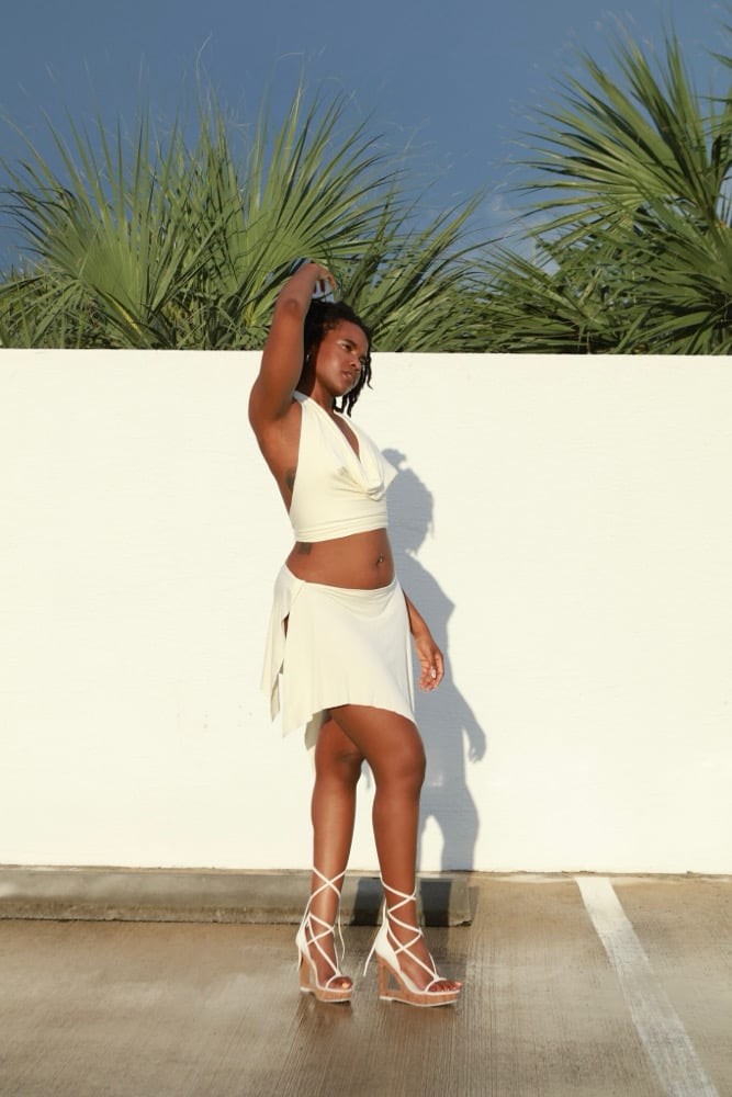 Flowy. Flirty. Feminine. The Flow Skirt gently drapes over your curves and dances with you with every step. She features an open side, for a peek-a-boo leg moment, with flirty a tie closure. In the color Pearl. For a completed flirty look, pair her with the Deep Scoop Halter blouse. Final skirt will be double layered. The longest layer is pictured.
