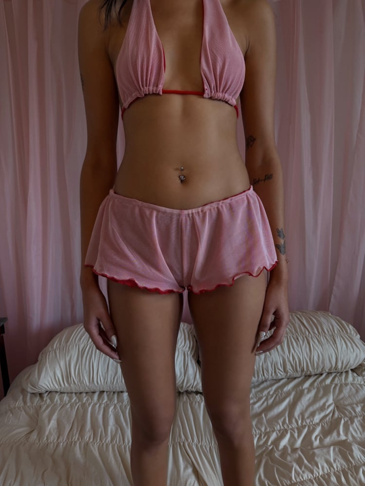 Double lined and fully reversible nylon mesh ultra mini shorts with a covered elastic waistband. This item was designed to offer double the fun with its doubled mesh/reversible feature. She's comfy, stretchy and cute. Blush pink and lipstick red - a beautiful combo for those who look for romance year round.